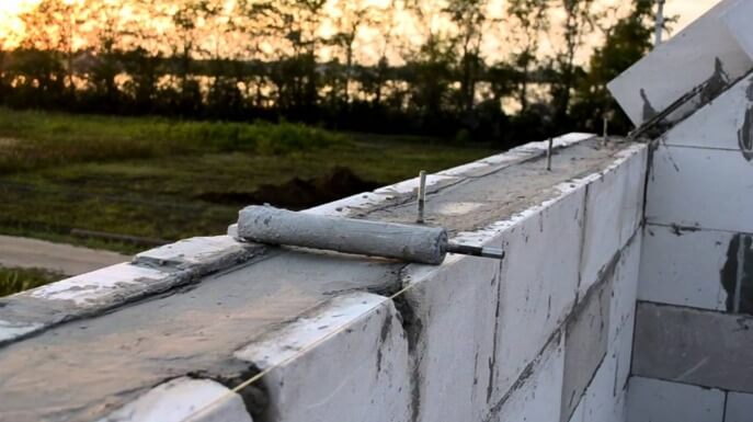Устанавливая армопояса с помощью блоков, не потребуется много усилий. Монтаж прост в исполнении и не займет много времени. Газоблоки укладывают на стены, оставляя в центре рядов пустоту, после чего этот промежуток заливается бетонным раствором.