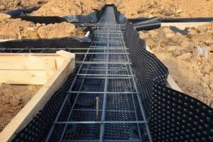 - Профильные мембраны. Данный метод закладки фундамента считается самым современным. Его изобретатели заявляют, что он способен заменить вышеперечисленные подготовительные работы. Использование таких мембран позволяет исключить «мокрую» работу. Вместе с тем застройщики могут сэкономить средства. Эти профили легко укладываются, что в значительной степени ускоряет строительство площадки.