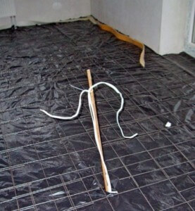 Не рекомендуют монтировать арматуру на подложку, следует сделать зазор в два сантиметра. Если эксплуатация основания не влечет за собой больших нагрузок, можно использовать мягкую армирующую сетку. Тогда для ее монтажа следует забить штыри, по которым будет натягиваться сетка.