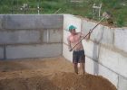- Когда высохнет гидроизоляционное средство, необходимо выполнить засыпку песком территории возле стен с внутренней и наружной стороны. Стоит отметить. Что все слои нужно утрамбовывать виброблоком.