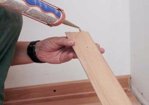 Декоративная планка подносится к бетону и сильно придавливается. Как обеспечить плотное прилегание плинтуса? Можно концы панели закрепить саморезами, если плинтус деревянный – шпильками, при отсутствии такой возможности, придавить материал к стене тяжелыми приспособлениями. Данный вид крепления отличается своими минусами:
