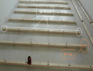 Чтобы прикрепить лаги на поверхность из бетона, для начала нужно соблюсти определенный промежуток между ними. Применяют доску с толщиной, от которой будет отталкиваться размер шага при укладке брусьев на бетон. Так, доска, толщина которой два сантиметра, фиксируется на балки с шагом в 200 мм.