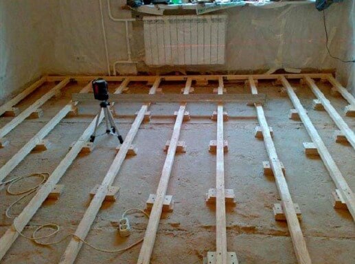 Сооружение из брусков возможно как для монтажа чернового пола, так и чистового. Выбирая материал, нужно отталкиваться от его внешнего вида, дороговизны и собственных предпочтений.