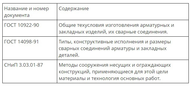 СНиП 3.03.01-87, устанавливающий нормы для всех этапов установки железобетонных конструкций, технологии и материалы. ГОСТ 10922-90, устанавливающий общие условия формирования изделий из арматуры и закладных деталей их сварки в железобетонных конструкциях. ГОСТ 14098-91, стандартизирующий виды конструкционного исполнения, геометрические параметры соединений при сварке закладных деталей и арматуры. Требования перечисленных документов включаются в проект производства работ на объектах строительства (ППР).