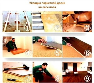 Конструкция из лаг тщательно горизонтируется. Лаги неподвижно крепятся к бетонной стяжке через утеплитель саморезами с дюбелями. Неподвижность собранных планок на массиве фанеры обеспечивается саморезами или гвоздиками, длина которых в 2 – 2,5 раза больше толщины плашек. Они устанавливаются в пазы досок под углом в 45 градусов так, чтобы не мешать монтажу.