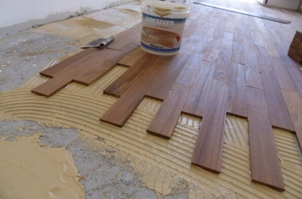 Паркетный пол монтируется, начиная с нанесения клея на предварительно жестко прикрученный к стяжке слой влагостойкой фанеры. Подложка, разрезанная на небольшие листы, устанавливается на бетонную основу вразбежку с зазорами до 5 мм между ними и образованием компенсационного зазора со стеной. Технология предусматривает жесткую фиксацию на клей всего деревянного массива плашек. Наибольшую прочность и надежность обеспечивают двухкомпонентные полиуретановые клеи. Они безопасны после высыхания, но токсичны при использовании.