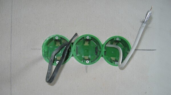 Предстоит сделать сугубо строительные и электротехнические работы. Создаются штробы для электропроводки, высверливаются коронкой углубления под коробки. В штробы укладывается кабель, который следует закрепить в бетонной стене. Кабель-канал шпатлюется. Затем на места устанавливаются подрозетники. После отделки стен розетки подключаются к кабелям.