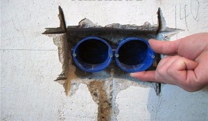Она погружается в бетонную стенку на всю глубину корпуса. Насадкой-лопаткой выбивается цилиндр высверленного бетона. Дно отверстия выравнивается. Проводится примерка подрозетника. Так можно сделать необходимое количество отверстий.