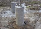 - На отметке 1,5-2 метра от поверхности земли проводят армирование колонны (сваи). Для этого в скважину, заполненную бетонным раствором, вставляют армирующие стальные пруты, которые выступают над поверхностью сваи для будущего сцепления их с ростверком.