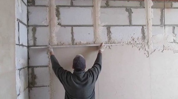 Для отделочных работ специалисты пользуются инструментарием для оштукатуривания. Смесь приготавливают в емкости соответствующего размера. Раствор перемешивают при помощи миксера либо дрели. Тонкослойная штукатурка по газобетону наносится на блоки мастерком или кельмой. Затирание поверхностей осуществляется с помощью терки. Полутер применяется для снятия излишек смеси. Поверхность блоков внутри стенок выравнивают маячками. Штукатурка газобетона стягивается правилом между направляющими. Строители определяют качество проведенных работ рейкой.